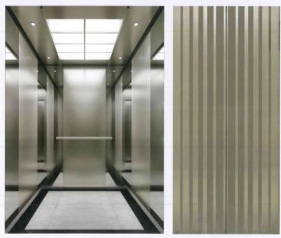 轎壁:三側(cè)轎壁均為中間香檳金噴砂兩側(cè)香檳金鏡面不銹鋼,底部鏡面不銹鋼腳線